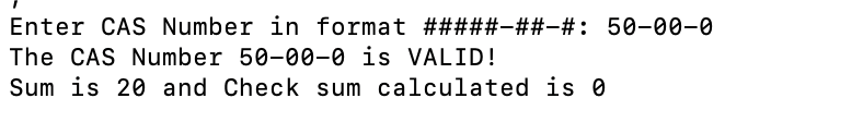 A little program to check the validity of a CAS Registry Number. This is a check digit algorithm as described here. This just checks whether the number is valid and does not take you to a reference for the actual chemical compound. If you want that, then you can Google it.