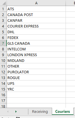 For the dropdown fields of Courier, Supplier, and Staff, I wanted an easy way for anyone to modify the lists without having to go in and edit the code or the form itself. Placing the lists on separate worksheets accomplished this.