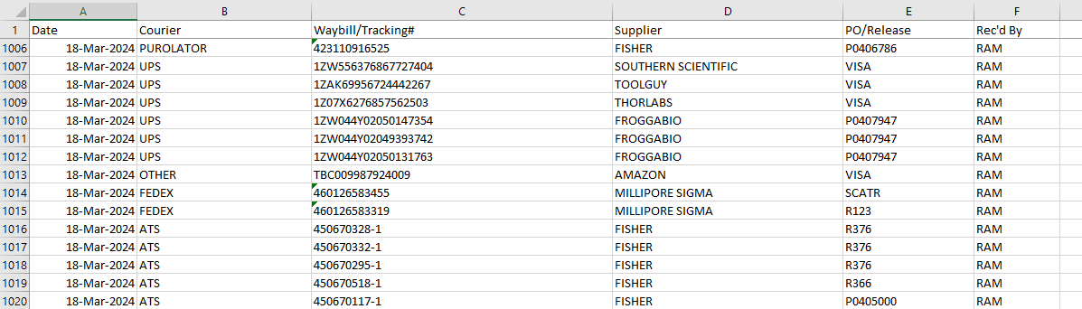 At my workplace before I came onboard, they were tracking incoming packages on paper. They had to write down items such as date, courier, waybill/tracking number, supplier, and purchase order number. Keeping these sheets around and trying to look for any particular delivery at a later date was a nightmare.