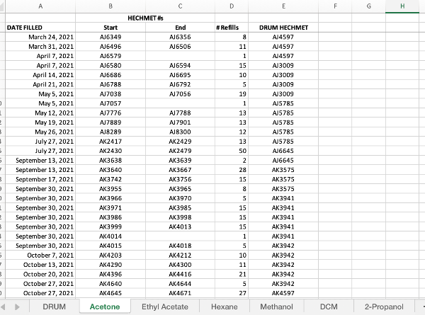 Building upon the concepts in the Receiving Log described above, I created a spreadsheet to track the drums and the individual solvent refills. The HECHMET items shown are hazardous substance inventory barcodes that are the key to matching the refills to the drums.